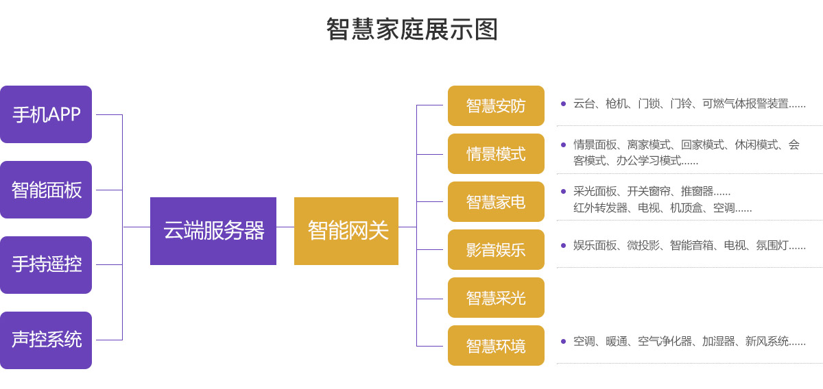全屋智能家庭系統(tǒng),結(jié)合物聯(lián)網(wǎng)、云計(jì)算、移動(dòng)互聯(lián)網(wǎng)和大數(shù)據(jù)等技術(shù),讓家庭智能產(chǎn)品與人實(shí)現(xiàn)互聯(lián)互動(dòng),打造出更宜人居、更節(jié)能環(huán)保的現(xiàn)代家庭生態(tài)系統(tǒng)。它主要包括家庭智慧安防、情景模式、智慧家電、影音娛樂(lè)、智慧采光、智慧環(huán)境等功能模塊。
