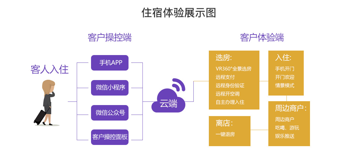 智慧酒店方案融合自動化控制系統(tǒng)、移動互聯(lián)網(wǎng)、物聯(lián)網(wǎng)和網(wǎng)絡(luò)通訊技術(shù)于一體,為客人提供從入住到退房一整套的酒店入住解決方案。